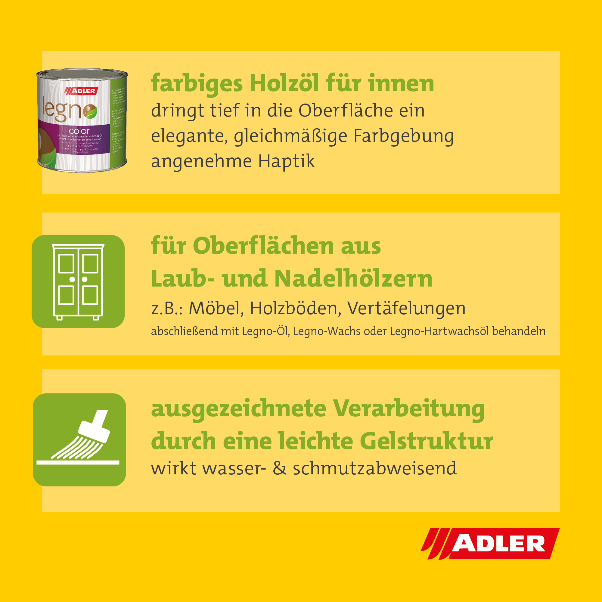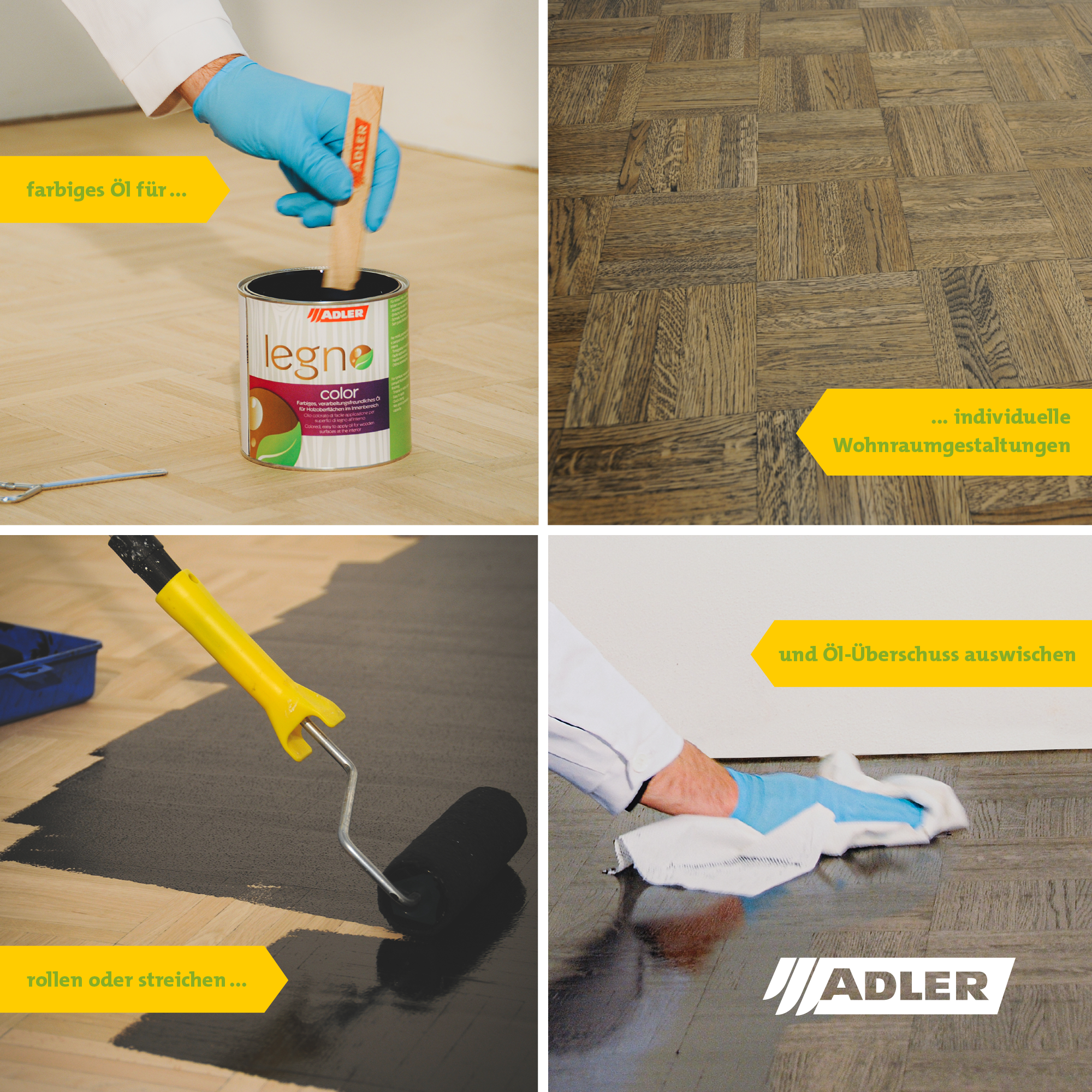 Pentru rezultate optime, se recomandă aplicarea unui sistem complet. După stratul de ulei colorat Legno Color, se aplică încă două straturi de ulei Legno Dura. Aceste straturi suplimentare cresc rezistența la uzură. Ele oferă și o protecție superioară în timp.